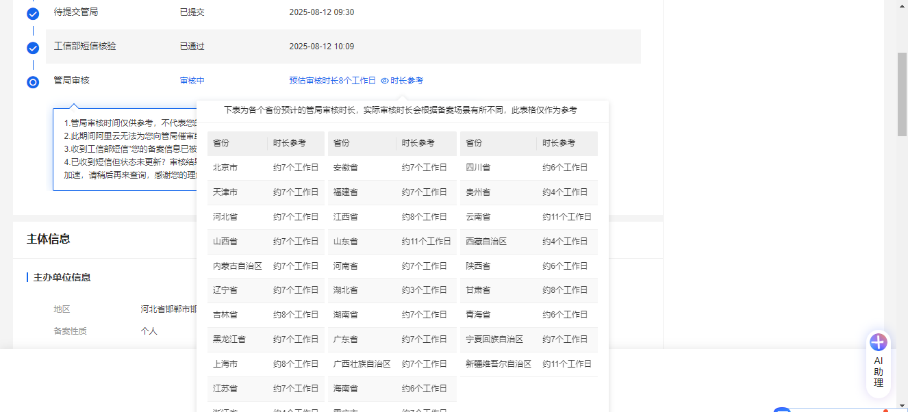 比如点击查看各省ICP备案的时效大概多久,给大家一个参考值。